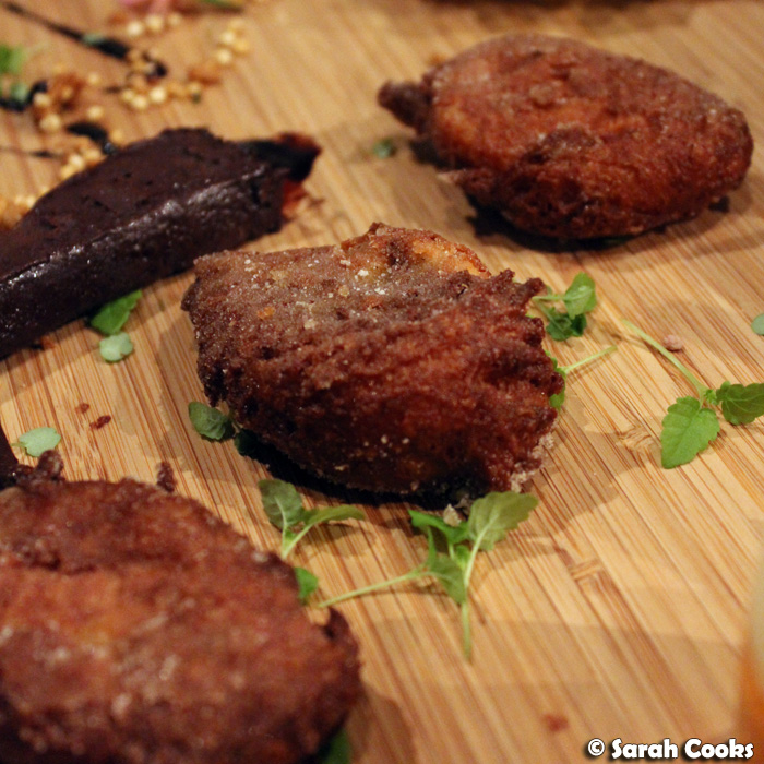 I think you could make a sauce out of the pan juices (indeed, all the connective tissue in the pork shoulder will produce a particularly nice, jellied sauce), but there really is too much fat floating the pan around to be able to do this easily. (At this particular lunch, you'll remember we also had a bunch of other dishes to prepare, so I didn't have time to be carefully straining and spooning off the pan juices).