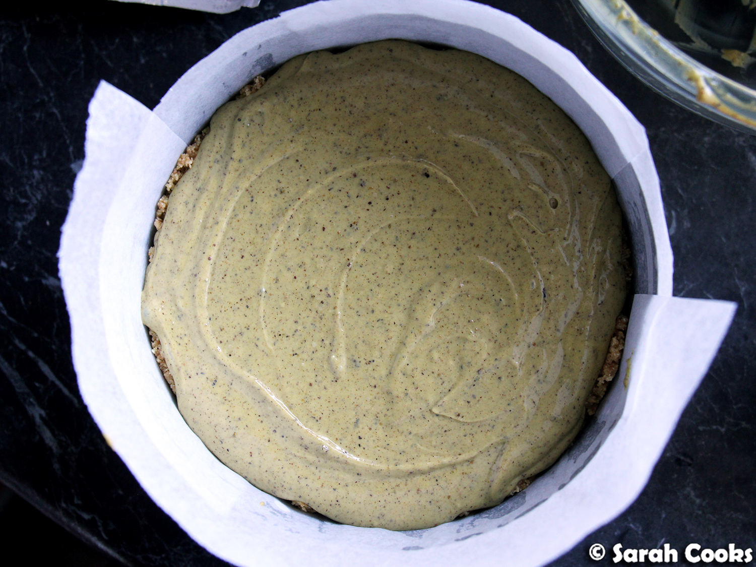 | Pistachio cheesecake, ready for baking |